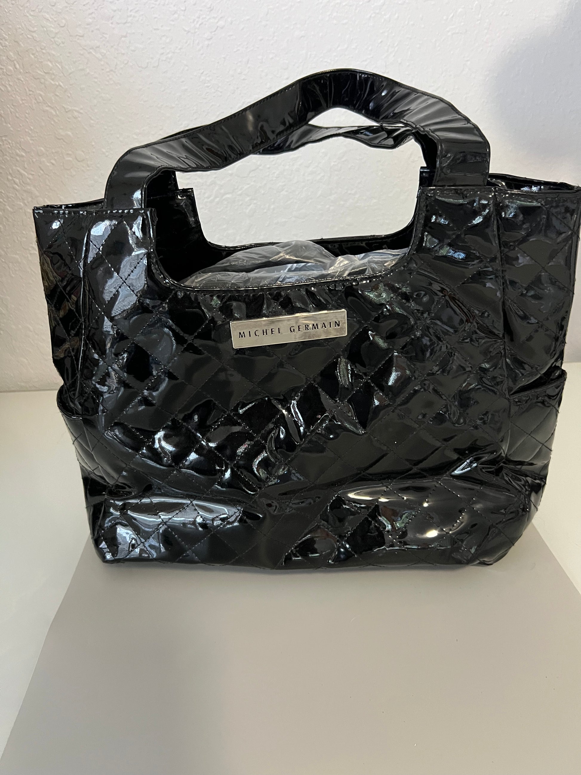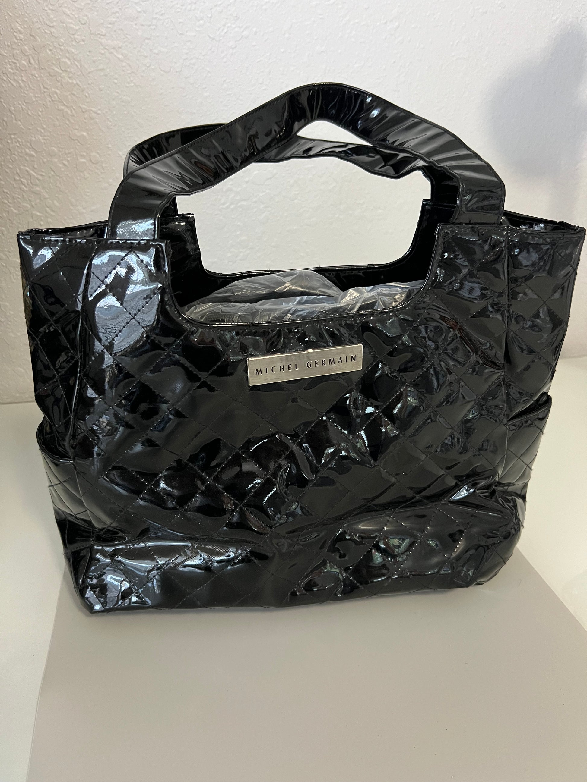Michel Germain Quilted Black Handbag: Featuring a sleek, shiny finish and diamond-shaped stitching details, this handbag offers a sophisticated and modern look. It's perfect for formal outings or adding an elegant touch to your everyday ensemble.