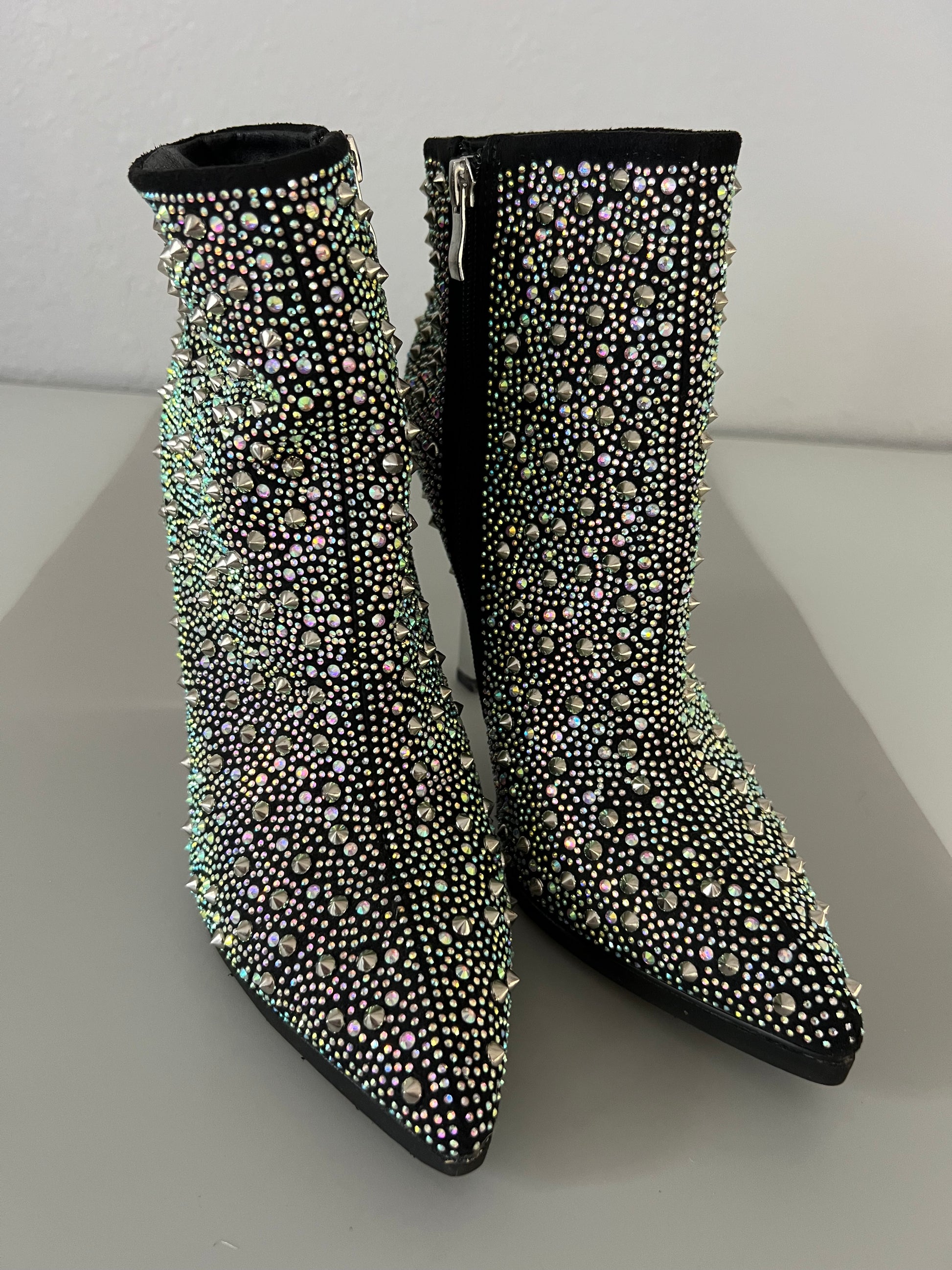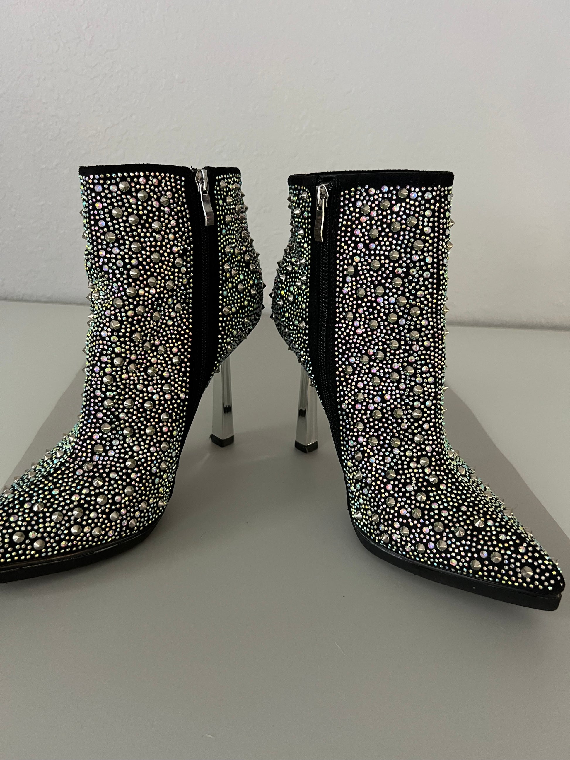 Dare to shine with these stunning high-heel boots! Crafted from elegant black fabric and adorned with iridescent appliques, every step catches flashes of light that ensure you won't go unnoticed. Featuring a pointed toe and a side closure for a comfortable, secure fit, these boots also boast studded details that add a rebellious yet sophisticated touch. Perfect for special events or for elevating any outfit with a hint of glamour. Make them yours and step out in footwear that effortlessly combines luxury and style with every stride! size 9