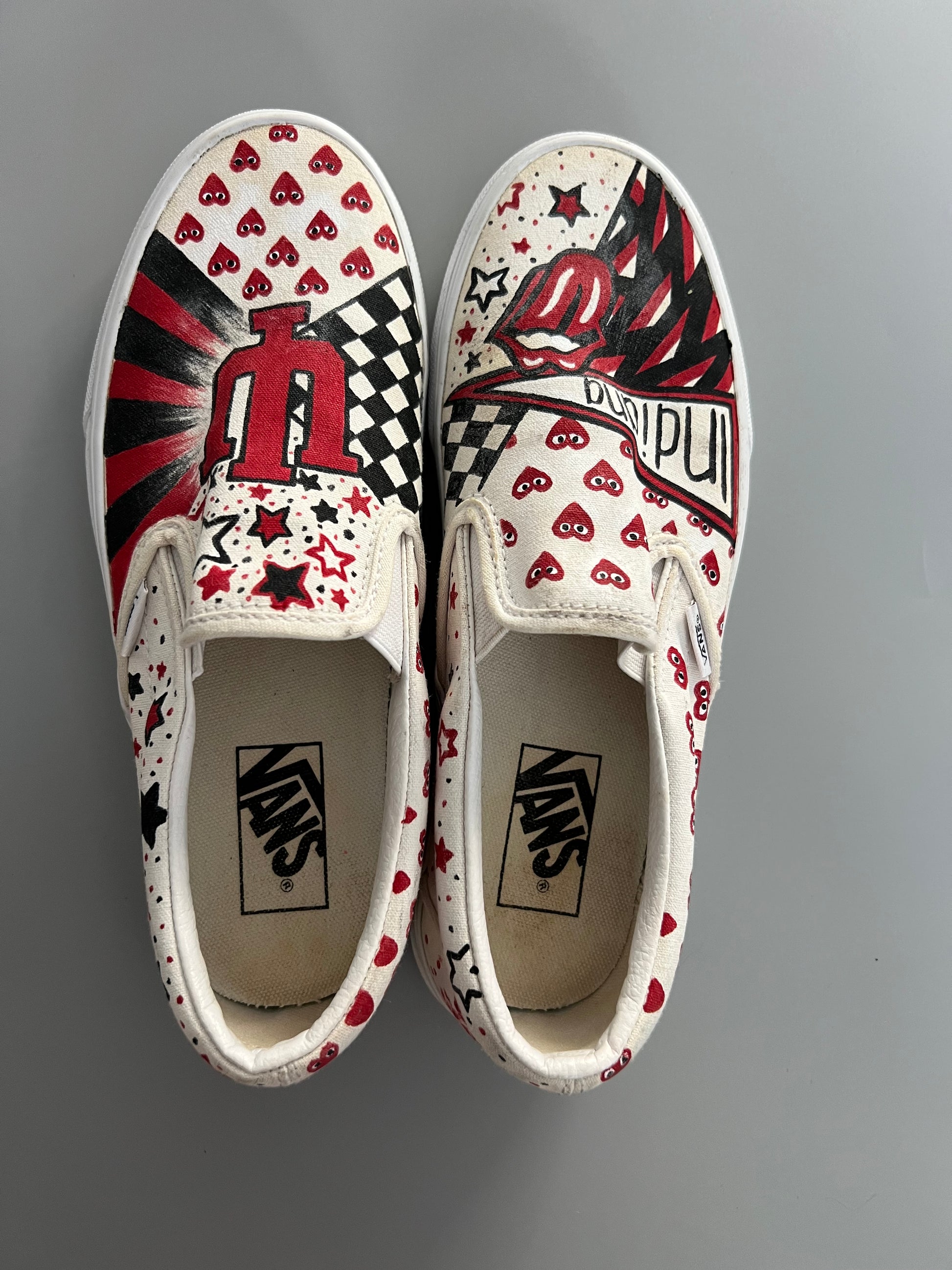 Stand out with these custom slip-on sneakers, hand-painted with a vibrant design that combines hearts, stars, plaid motifs, and pop culture-inspired details. Made from durable canvas with a comfortable interior, they offer a lightweight and versatile wearing experience. Each pair is a unique work of art, perfect for those who want to express themselves with bold, authentic style. Step out in sneakers that truly make a statement! size 8 women.
